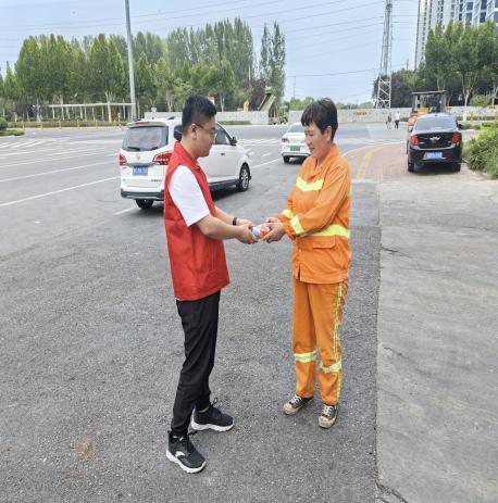 活动当天,项目志愿者提前备妥饮用水,循着环卫工人的作业轨迹,前往镇内主要街道、农贸市场门口等作业集中区域。沿途看到环卫工人,便双手将饮用水递到他们手中,轻声道一句“您辛苦了”。朴实的语言搭配清凉的饮品,瞬间让环卫工人的脸上绽开欣慰笑容。